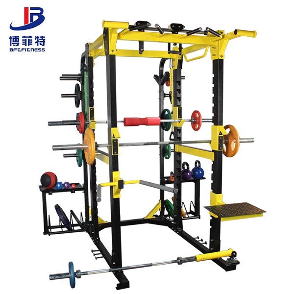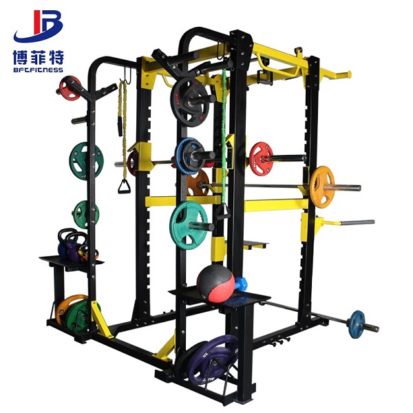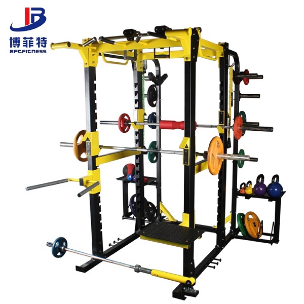 商用健身房大型深蹲架,專業多功能深蹲臥推綜合訓練器,組合健身器材廠家批發直銷,模塊化功能可定制,兩側有杠鈴片架和置物托盤,可進行深蹲、臥推、T杠劃船、雙杠臂屈伸、跳板、引體向上等訓練